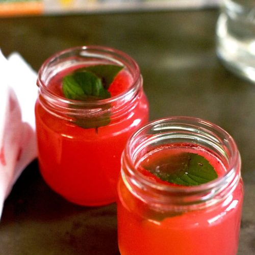 I serve my punch with fresh mint leaves from our garden and little ice cubes made with watermelon juice. I also use mini mason jars as the cups to keep the portion sizes down. And besides, everything is cuter when it is mini. For sure.