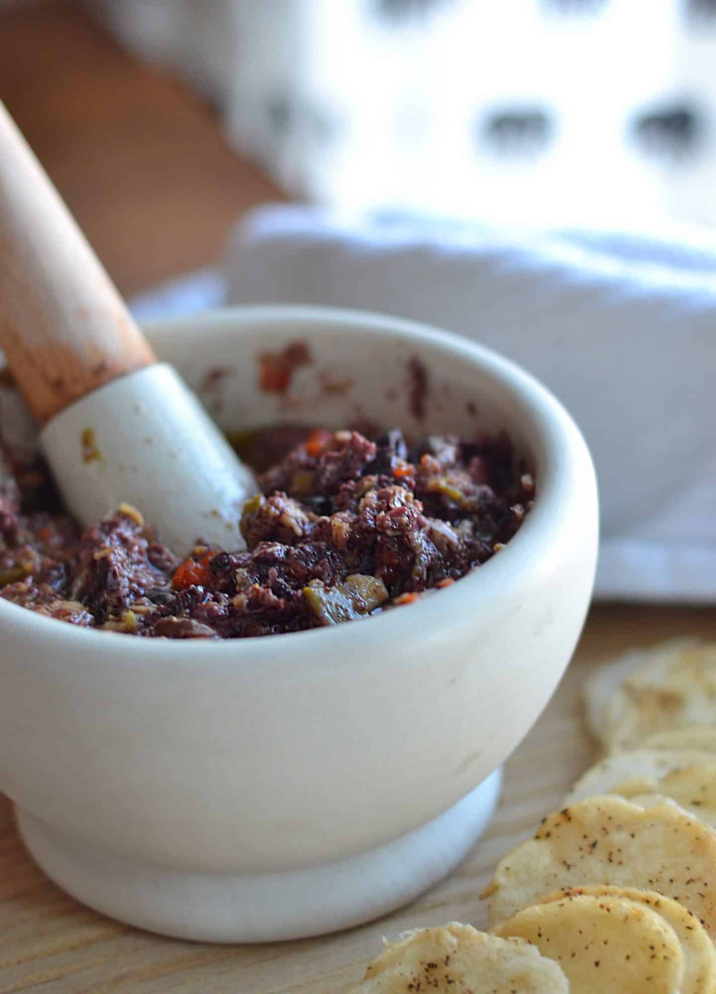 For the basic olive tapenade I use a mortar and pestle (fancy little name for a basic little tool) but feel free to pull out your food processor or even have a go with a potato masher. The name of the game is smushing olives and garlic so use whatever tools work for you and that you have on hand!
