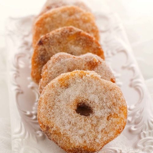 Have your cinnamon and sugar mixed up ahead of time so those hot doughnuts can go straight into the mixture. Sometimes I’ll add a bit of cayenne or chili powder to the mixture for a fun little heat.
