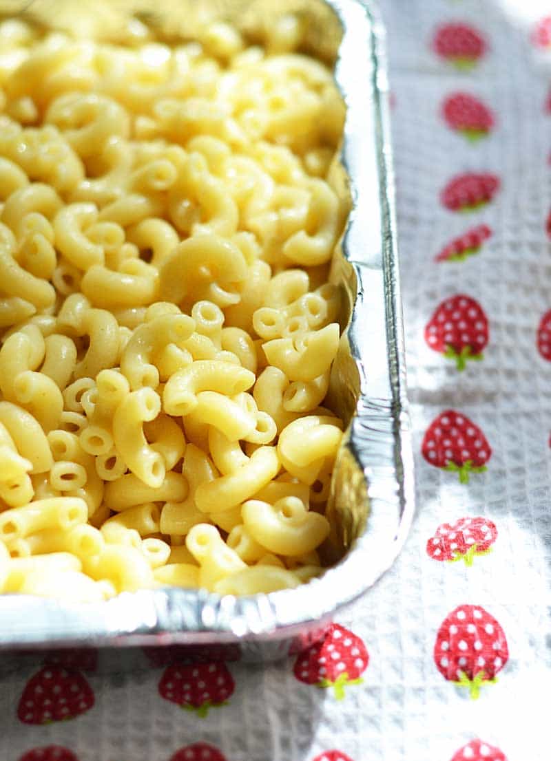During the summer months, I always keep a stock of the disposable aluminum pans because they are brilliant for campfire cooking! For campfire macaroni and cheese I will sometimes make one big ol’ batch OR sometimes make mini ones that are personalized for each person. It completely depends on my mood and stock of pans.