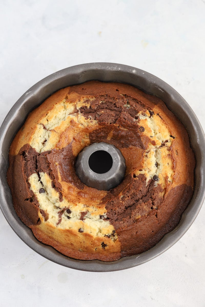 This bundt cake recipe, however, uses my favorite old-fashioned butter cake recipe as the foundation. Then I split that in half and turn one half into a rich, chocolate batter and the other half into a chocolate chip butter cake.