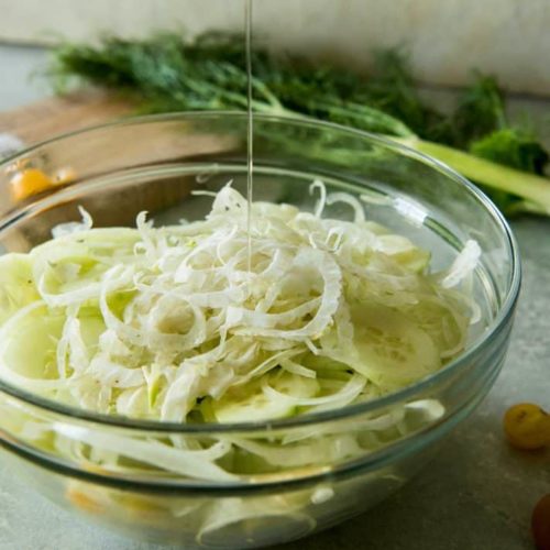 - Put the sliced cucumber, onion, and fennel together into a medium size bowl.