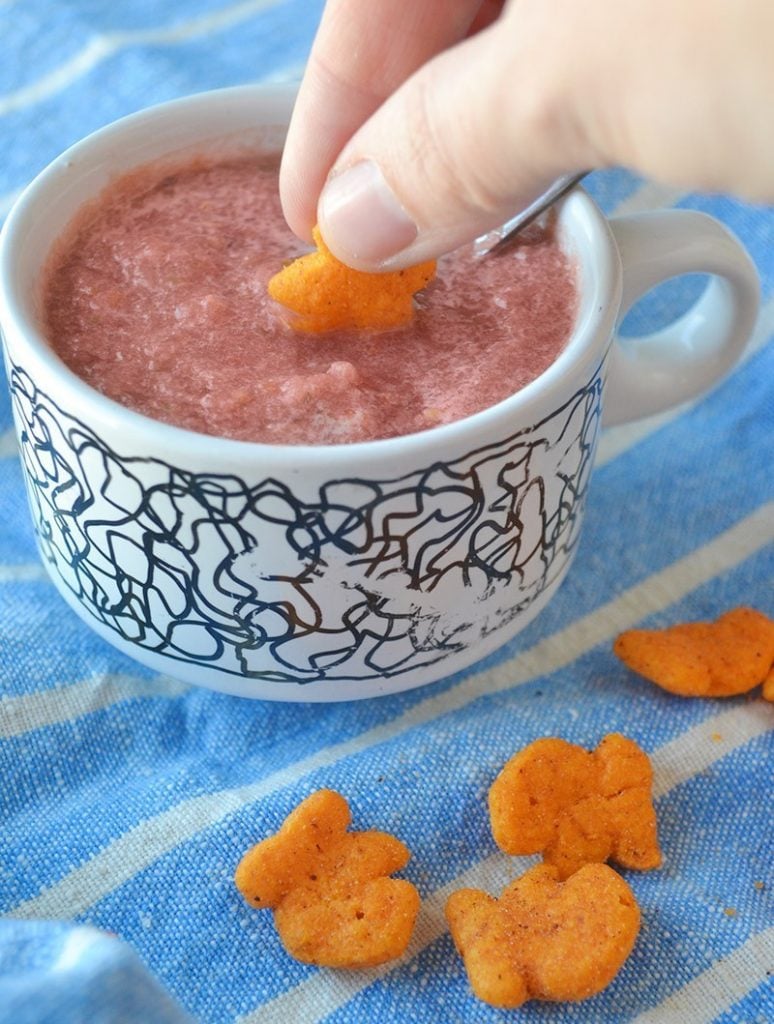 My kids love eating gazpacho after-school with BBQ Goldfish® Puffs. They just add a whole new level of fun in gluten-free form (bonus!). Frankly, they also love the combo of BBQ with the gazpacho. It’s all sorts of yummy! Levi puts the Goldfish Puffs in and lets them sit and marinate for a while before eating. I prefer to dip them in and eat them one by one. And Katie dumps them into her gazpacho and eats it right away. Either way … it’s delicious!
