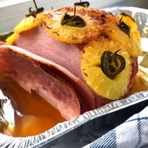 It’s just so simple! Use toothpicks to attach pineapple and jalapeno slices to the ham before you bake it. Cover it up and let it have a go in the oven. In fact, I don’t even use a pretty pan :). Sorry folks, I just use a simple disposable pan for all of my ham baking.