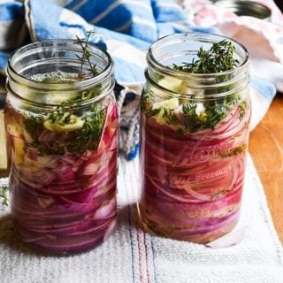 You totally can just stick with the simple vinegar brine and it would taste great! However, adding a bit of fresh herb and garlic is a quick and easy way to change up and deepen the flavor. I added fresh thyme sprigs, smashed garlic (another smelly hands one…gross!), and fennel seeds to my onion. - Let cool, cover, and store.