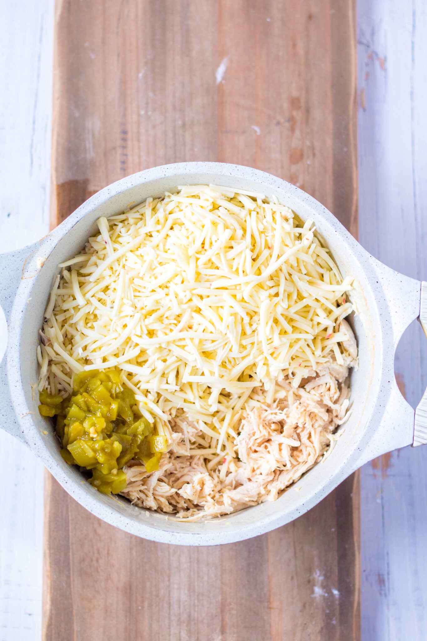 - Mix shredded chicken and 2 cups pepper jack cheese.