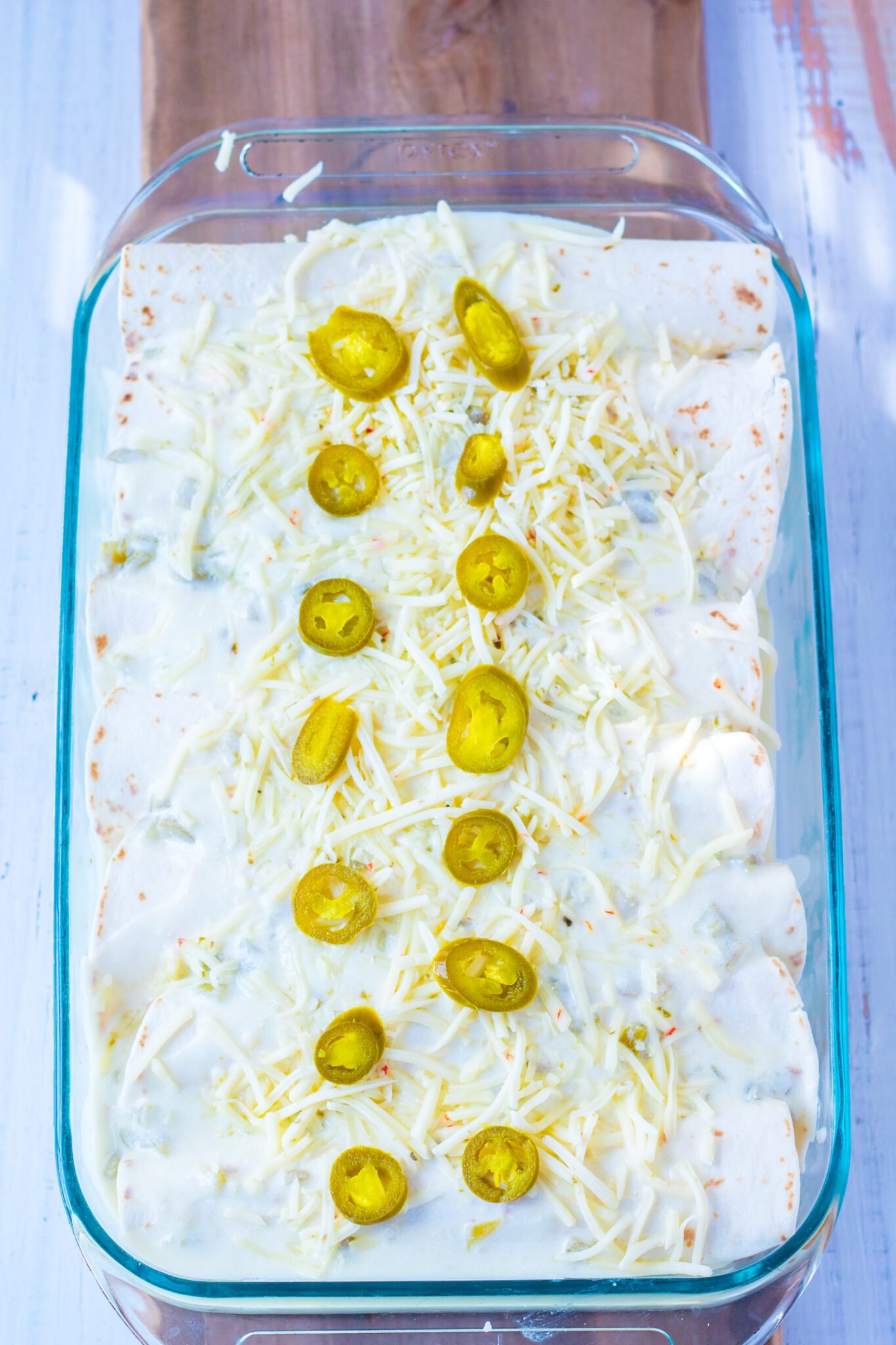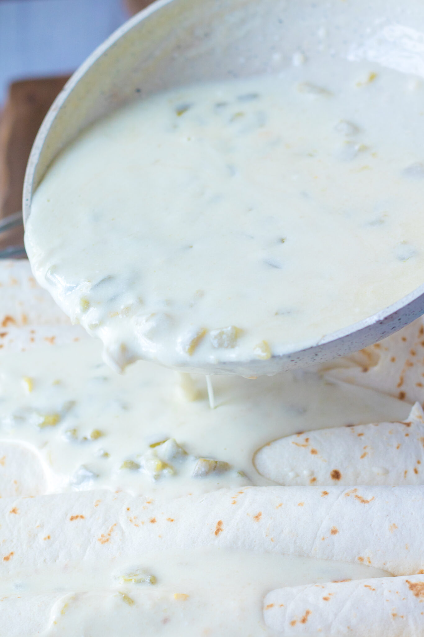 - Pour the white sauce over the enchiladas and top with remaining 1 cup of cheese.