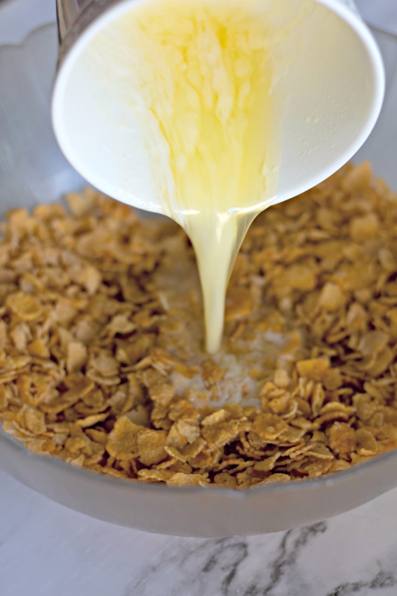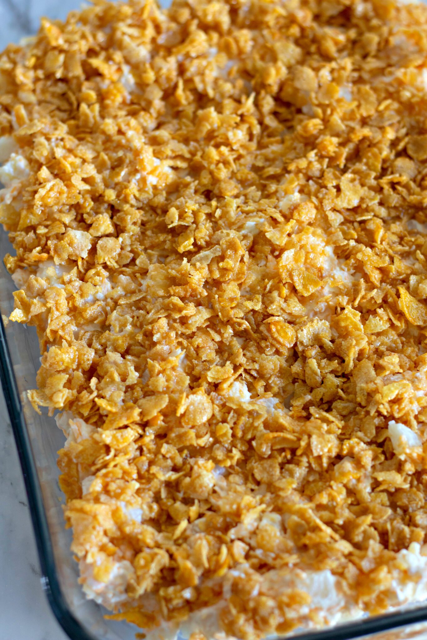 - In a medium mixing bowl, combine the ½ cup of melted butter and crushed corn flakes. Stir until the corn flakes are coated in the butter. Spoon the corn flake mixture over the casserole.