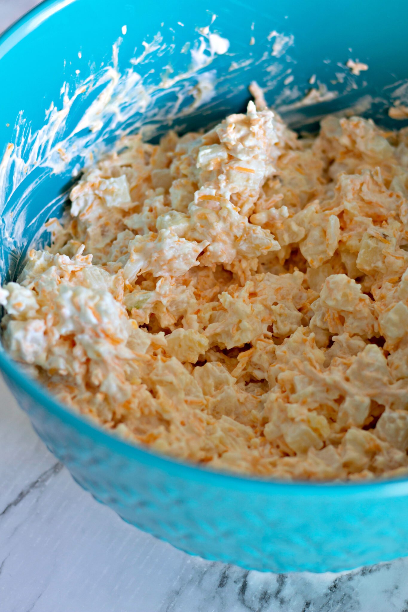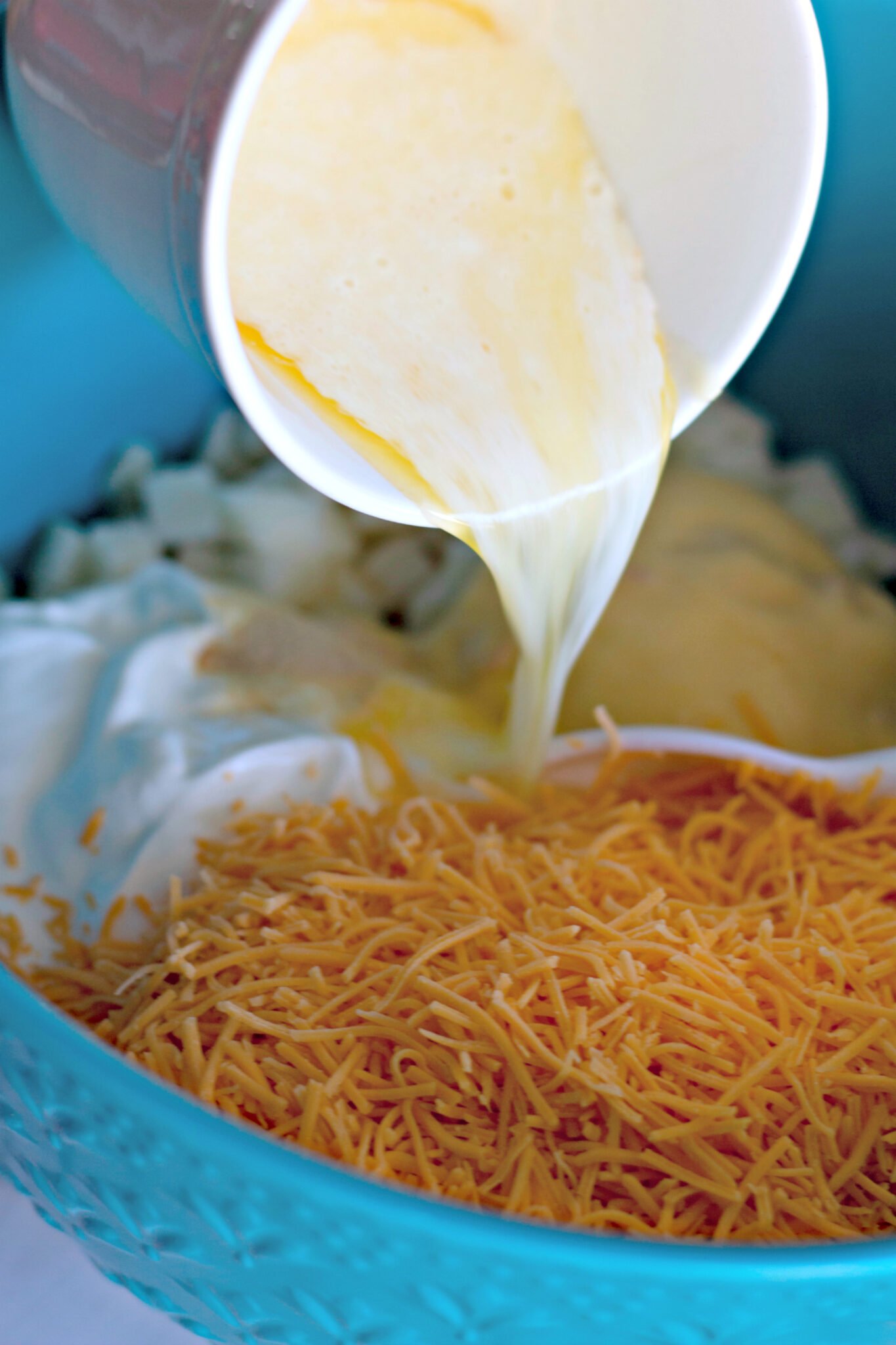 - Combine melted butter, sour cream, cream soup, salt, and onion powder with the shredded cheese and thawed diced hash browns.
