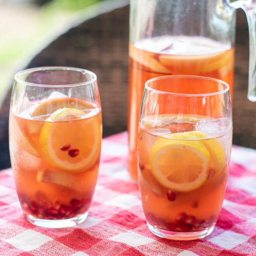 To serve, add 3/4 cup of mix to a glass filled with ice, top with ginger beer. Add fresh pomegranate seeds and sliced lemons.