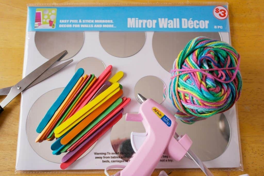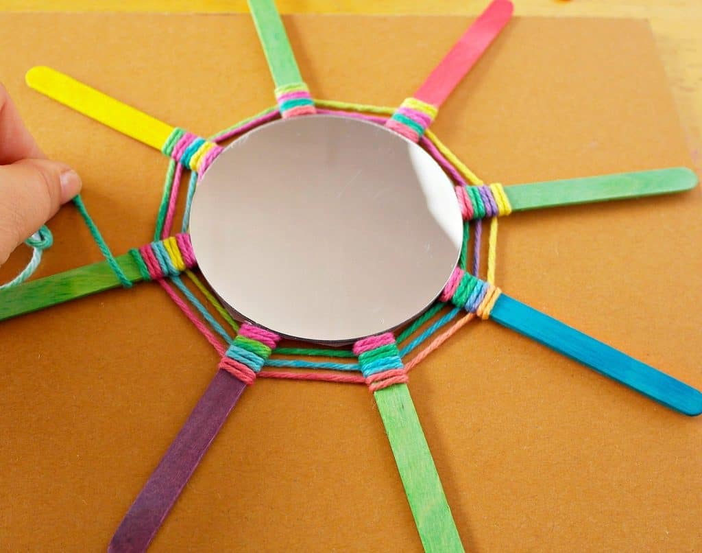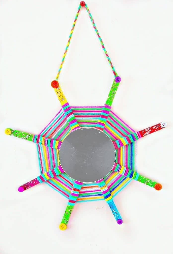 Mirror Craft Materials Package of small mirrors (found at most dollar or big box stores) Colored popsicle sticks Yarn Glue gun Scissors Glitter, buttons, sequins and any other embellishments of your choice (refer to photo) Instructions Flip the mirror over and arrange the colored popsicle sticks into a "sun" or "flower" shape. Hot glue them into place. (refer to photo) Unravel a few feet of yarn, hot glue the end onto the back of the mirror between 2 popsicle sticks (refer to photo) Start wrapping the yarn around each popsicle stick twice. Wrap twice, and go around the next popsicle stick twice. And so on. (refer to photo) Wrap the yarn as far up the popsicle sticks as you wish, end by securing the yarn on the back with hot glue. (refer to photo) Decorate as desired with glitter, buttons and more! A braided strip of yarn glued to the back of two popsicle sticks makes a great hanger!