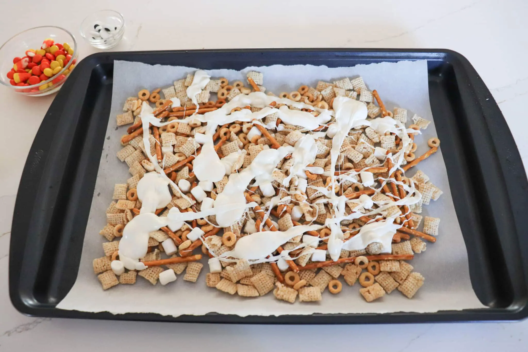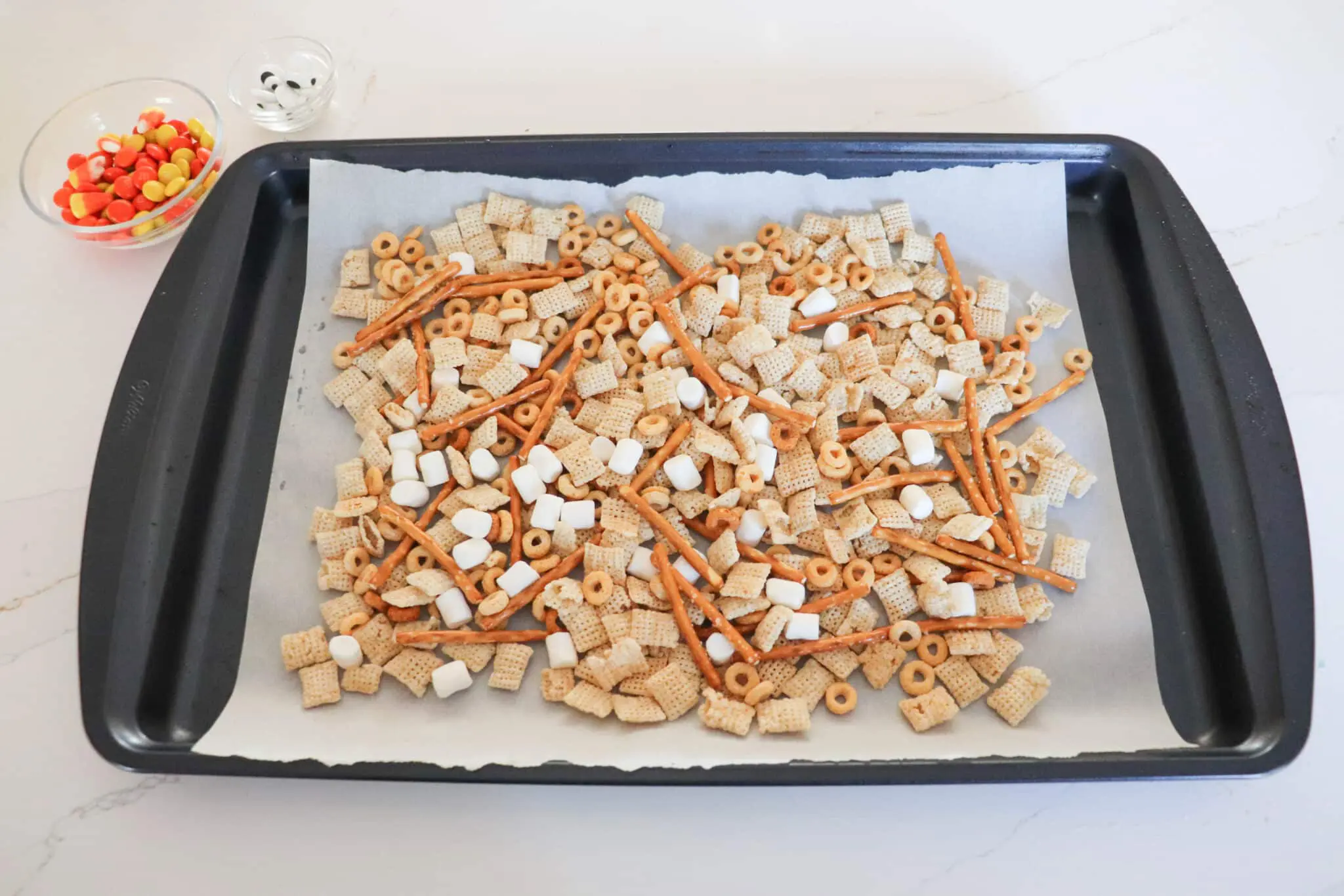 - Stir the Chex, Cheerios, and pretzels sticks together on the baking sheet.