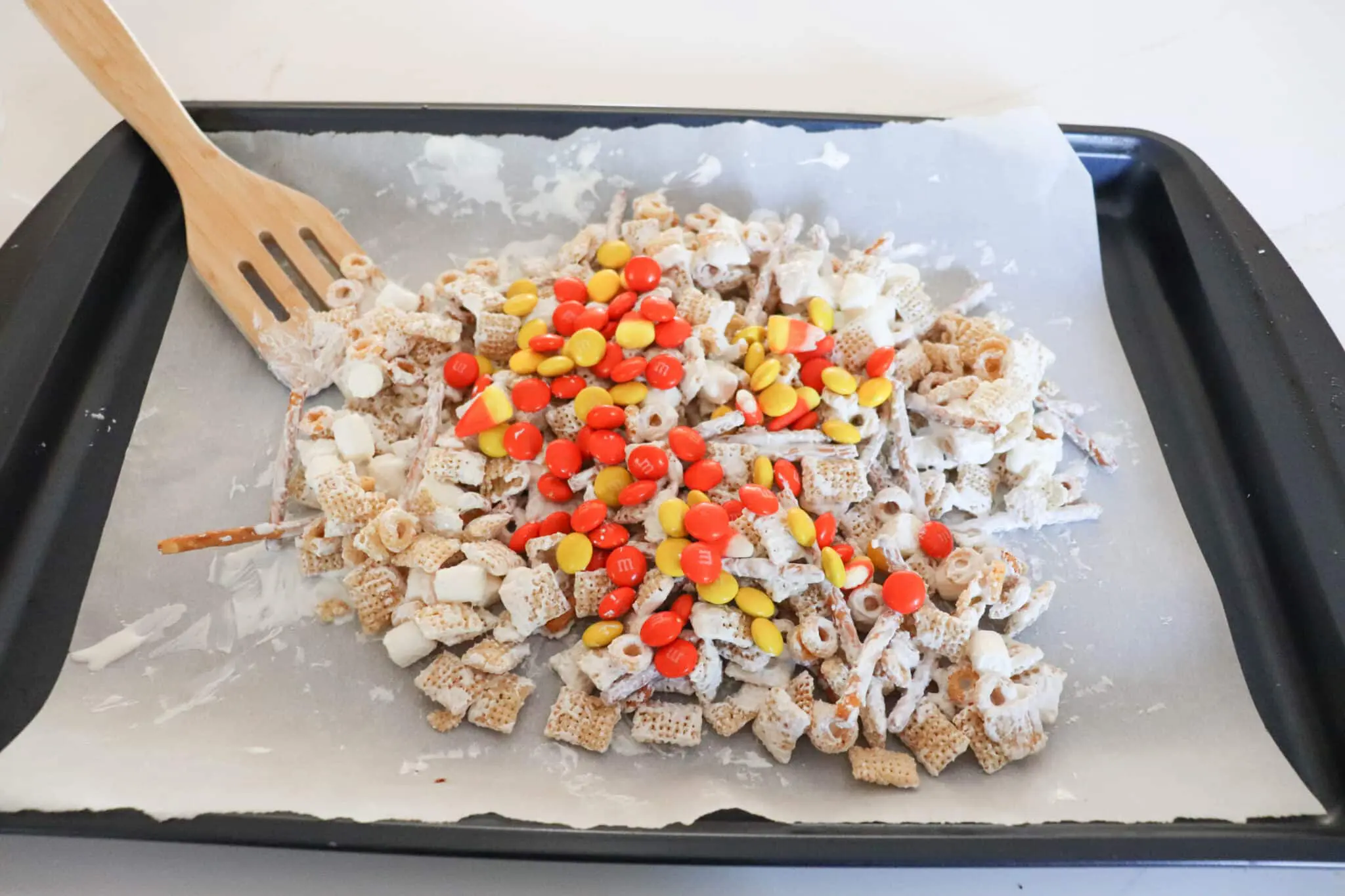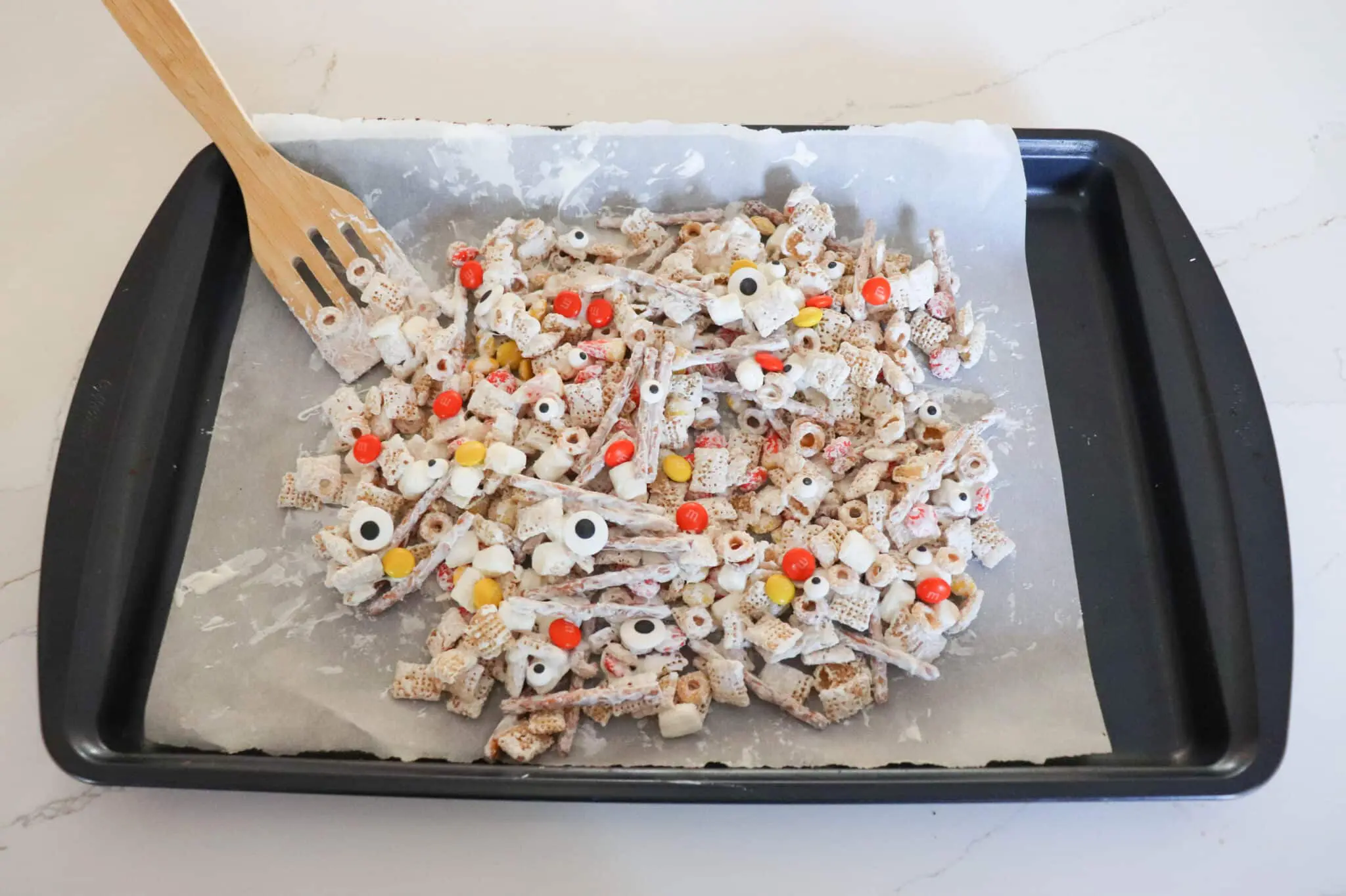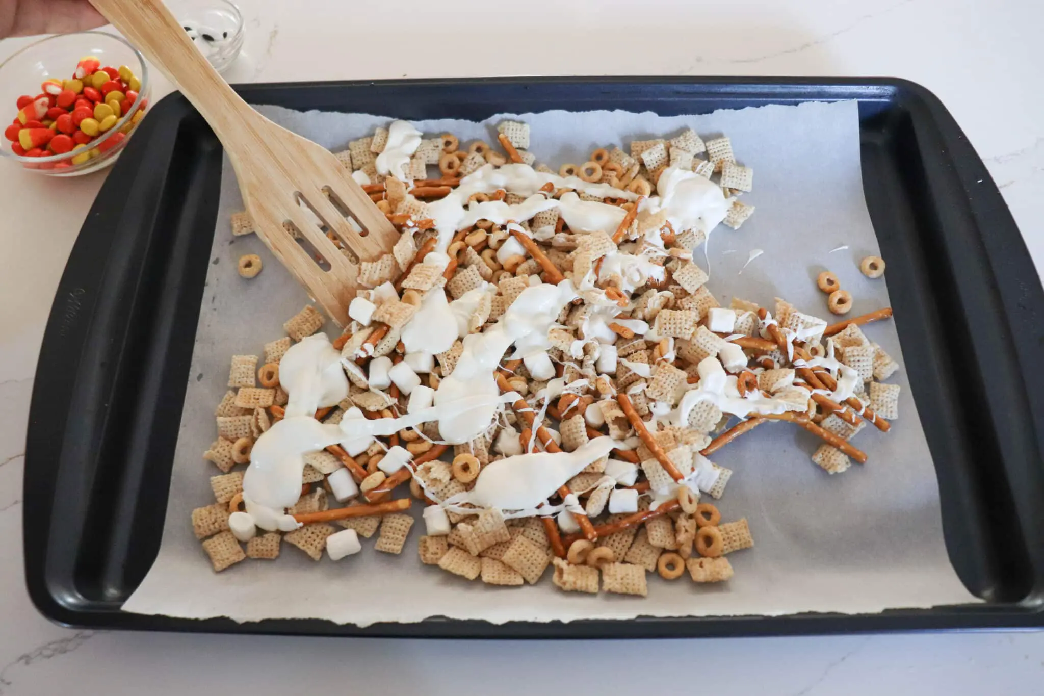 - Stir the Chex, Cheerios, and pretzels stick together on the baking sheet.