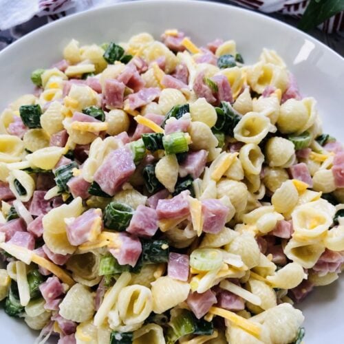 With only 5 ingredients, this Ham Pasta Salad couldn’t be easier, faster, and tastier. Yummy noodles with a creamy dressing, salty ham bits, cheese, and tangy green onions makes the perfect summer macaroni salad. One of my personal go-to’s for the summer potluck side dish table!
