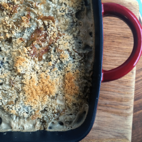 And certainly better for you.  There’s no cream in this recipe (sour cream doesn’t count, because it can be fat free).  There’s no cans of soup.  And there’s no butter.  That’s right, this is a winner.  There are a couple more steps to making this version, but we think it’s worth it.  And if you don’t, you can cut out the homemade french onions and still have a delicious, healthier version…but with a little less work. Or use the homemade french onions with your traditional base if you like! We want to give you some much-needed options for this holiday favorite!