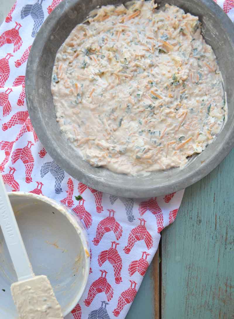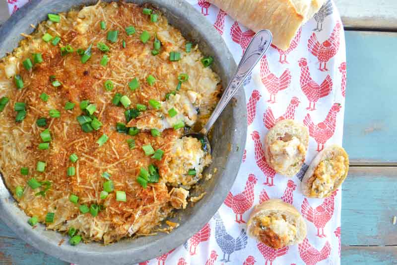 Why am I using a[easyazon_link identifier=”B002UNMZNU” locale=”US”]pie tin[/easyazon_link]rather than a gorgeous baking dish? First reason…I don’t own a baking dish just for a dip and feel no reason to purchase one when something I already own will suffice. Second reason…pie tins are used for everything here in Minnesota, even as plates (no really!?! some “cool” restaurants use them and everyone goes crazy for it!). Third and most importantly…I love the depth of pie tins for dips. They make it so you can get everything in the dip with one scoop.