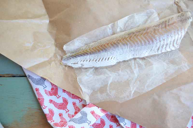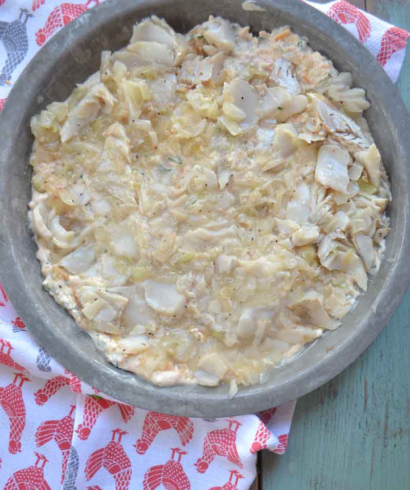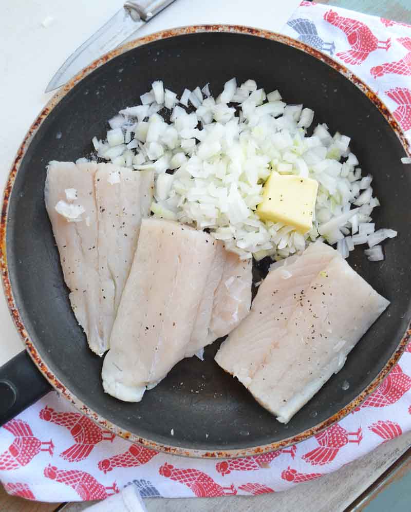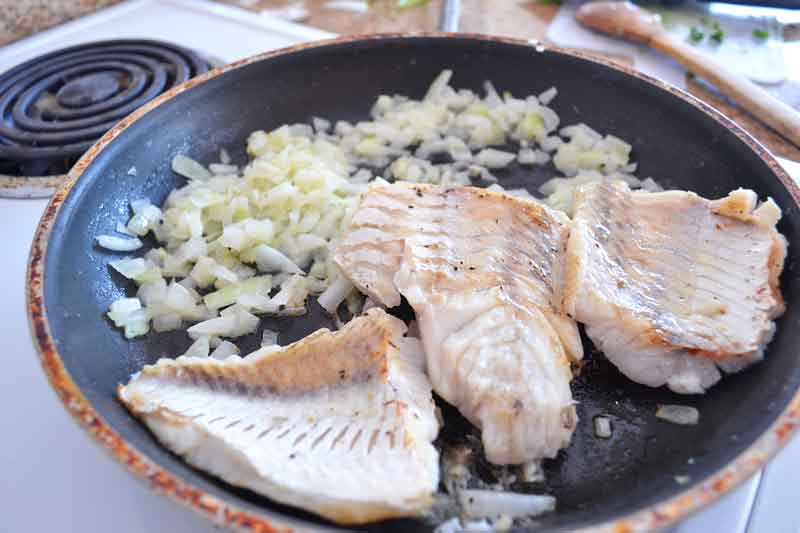 I always cook my fish skin side down with a pat of butter. When cooking a fish as special as walleye, DON’T skip the pat of butter. Walleye deserves you adding the extra calories. For this dip, I also cook onions along with the fish and then flip the fish over for a couple of minutes just to absorb some of that butter and onion flavor. That means that ALL of the flaky pieces have some great butter and onion flavor.
