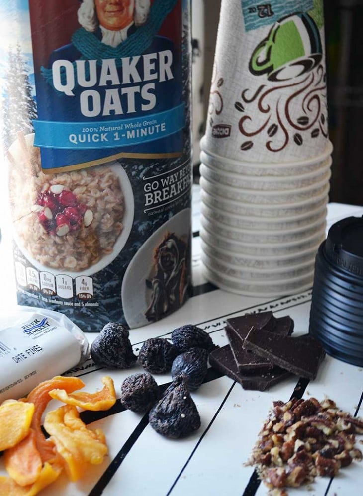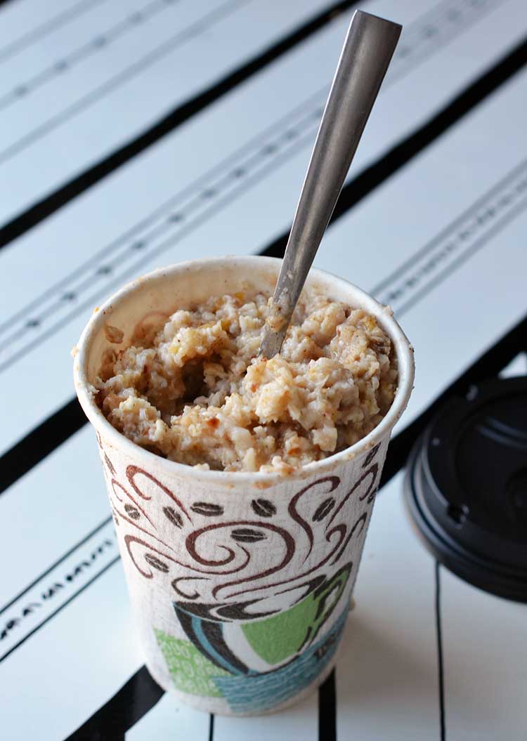 Let’s stop right here and talk about the [easyazon_link identifier=”B01K8LCB20″ locale=”US”]hot cups[/easyazon_link]. I am using plain old coffee hot cups because they were leftover from a potluck I had been a part of. I’m using them up. However, when they are gone I will absolutely be replacing them with environmentally friendly versions. I have seen instant oatmeal made in mason jars, and microwaveable containers, as well. Great options to think about. For me, I like the ease of using disposable and portable cups. My mornings are just that crazy.