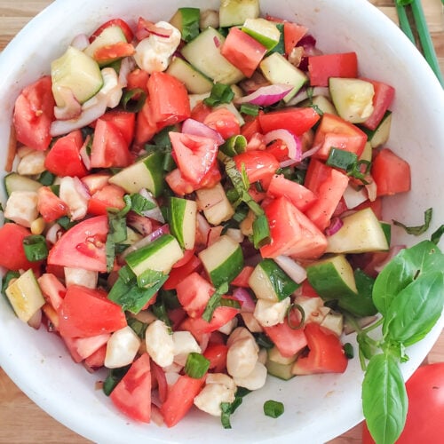 - In a large bowl, mix the cucumber, tomatoes, onion, and mozzarella balls together.