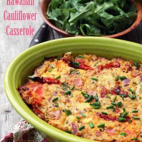 This casserole contains pretty much all of the same ingredients as this paleo Hawaiian pizza. If you like Hawaiian pizza and cauliflower, you will undoubtedly enjoy this casserole.