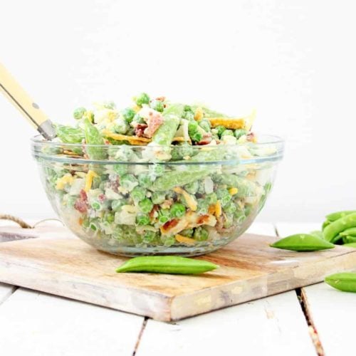 Sweet green peas are mixed with shredded cheddar cheese, bacon, and zesty onion and wrapped up in a creamy dressing. Mixed in are some new ingredients like sugar snap peas, tortilla strips, and water chestnuts to give this summer favorite salad a delicious upgrade. The best part is that this salad is mixed up and in the fridge in less than 30 minutes!