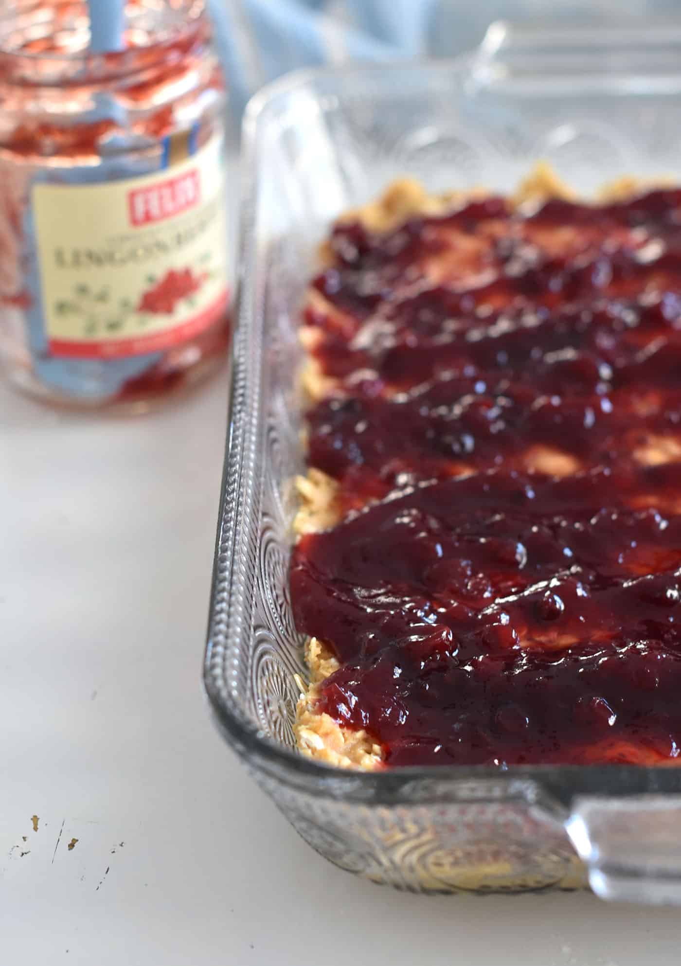 - If you like a little crunch, mix the peanuts into the remaining dough, then spread it over the top of the jam layer.