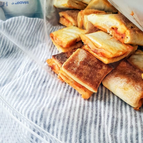 Pizza bites are so easy to freeze and heat later. Simply let them cool and place them into a large freezer bag and place in the freezer. Take out and reheat as needed. Store them in the freezer for up to one month.