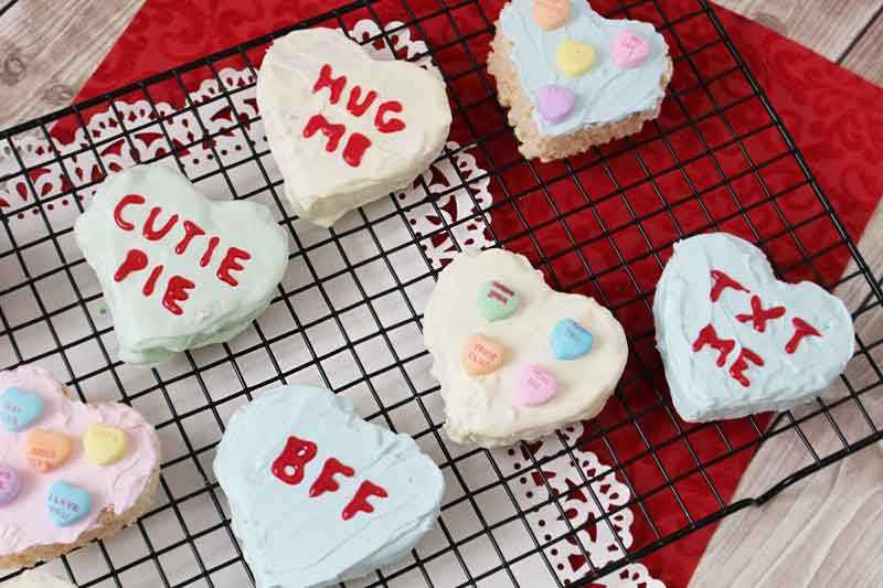 - Make up a batch of Rice Krispie treats and cut them into hearts. You can also use heart molds to make it easier on the kids. Just have them press the treats into the molds to get perfect heart shapes.