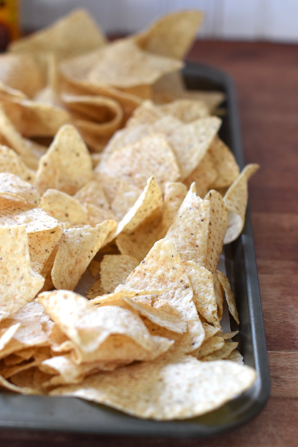 - Spread out the tortilla chips on the baking sheet.Â