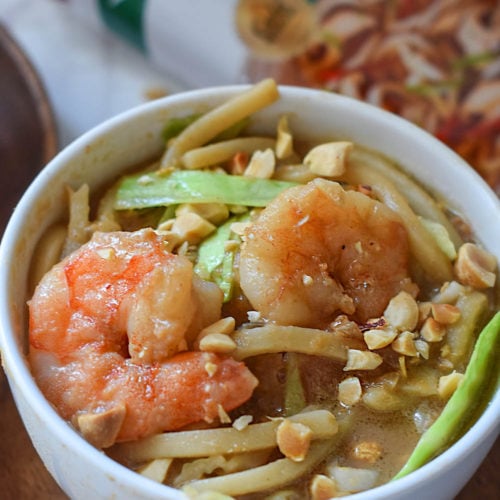 Flavorful broth, tender noodles, and fresh vegetables come together in a quick hurry into a yummy and simple udon soup chock full of shrimp.