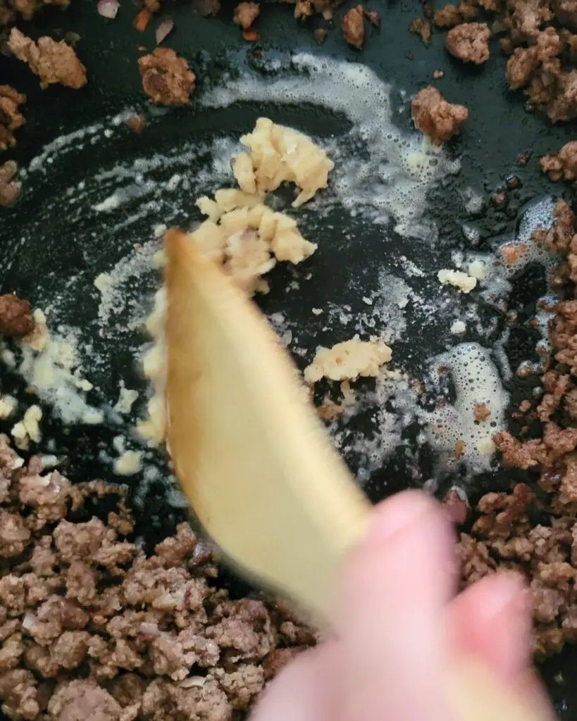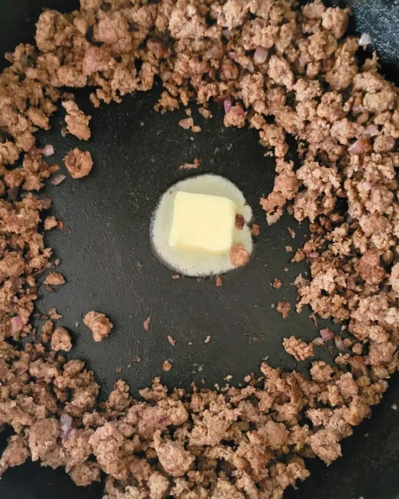 - Making the roux (flour paste): Push the meat and onion mixture to the edges again. Add the remaining 1 tablespoon butter (or olive oil) to the center of the pan and melt it over medium heat. Sprinkle in the flour and stir gently to form a smooth paste. Cook for about 1 minute until lightly golden—this cooks out the raw flour and thickens your sauce. Keep the heat at medium to avoid burning the roux, which would make the sauce bitter.