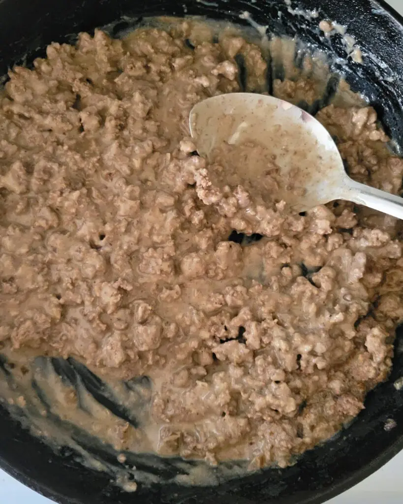 - Browning the beef: When you brown meat in a large skillet over medium-high heat, you’re creating those delicious, deep flavors through a process called the Maillard reaction. It’s what gives your gravy that rich, meaty taste. But if you rush or stir too much, you won’t get that nice crust, and your beef might end up stewy instead of flavorful and tender. After browning, drain the excess fat to avoid greasy sauce but leave a little for flavor.