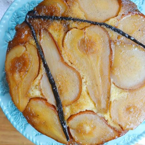 Tip: use an oven-safe or cast-iron skillet and you can make your cake right in it without transferring the pears to another pan. Save a dish!