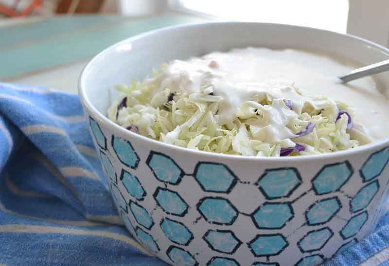 - In large bowl mix coconut milk, mayo, vinegar, and sugar together. Add the coleslaw mix and stir. Place in fridge until used.