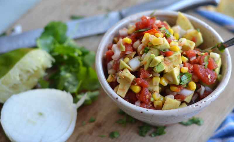 - In large microwave-safe bowl put in the can of tomatoes and frozen corn. Microwave for 1 minute. Add onion, avocado, juice from 1 lime, 1 tablespoon salt, and cilantro. Stir.