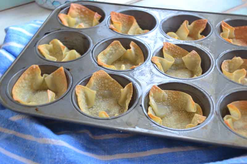 - Spray a cupcake tin with cooking spray. Press the wonton wrappers into the cupcake tin. Spray again with cooking spray.