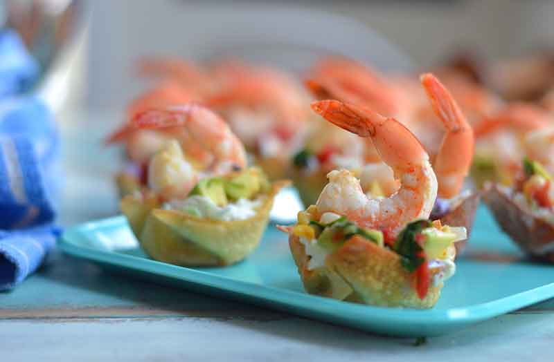 - To build the cups put about a tablespoon of coleslaw inside the wonton "cup", top with 2 tablespoons of salsa, and press a shrimp into the center of the salsa.